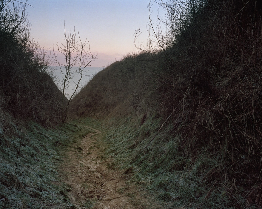 Les photographies couleur de la série Caux offrent une suite, ou plutôt le contrechamps de Jubilee. Ce que les hommes de Dieppe ont pu voir en débarquant. Un mur de pierre. Territoire géologique particulier, balayé par les vents violents de la mer, le paysage de cette partie du Pays de Caux agit encore comme une forteresse imprenable. Tout y semble d’une beauté dure et aride. Sanctuaire d’une mémoire douloureuse, l’Histoire semble pétrifiée dans ces lieux. Les ruines de cette partie du Mur Atlantic balisent la côte et révèlent toute l’austérité de l’endroit. D’un côté s’ouvre l’infini de la mer, une ligne. De l’autre, un mur de pierre qui bloque tout. Les falaises de craie blanche s’érodent et s’écroulent doucement, comme la mémoire. Les casemates, comme des trous béants sont partout, caveaux ouverts, cachettes oubliées. Ces vestiges sont le rappel d’un paysage occupé, jadis ultime rempart à prendre.